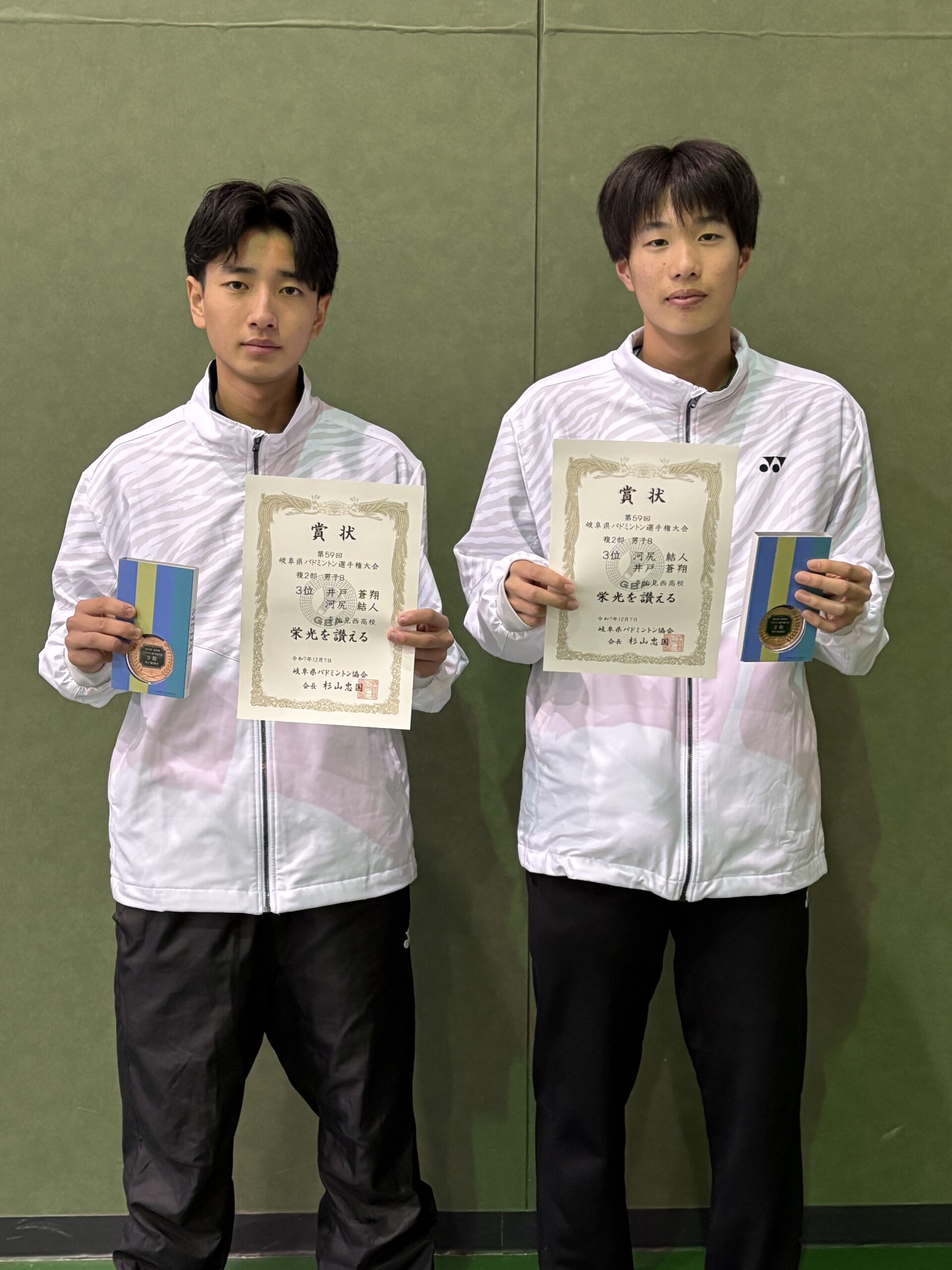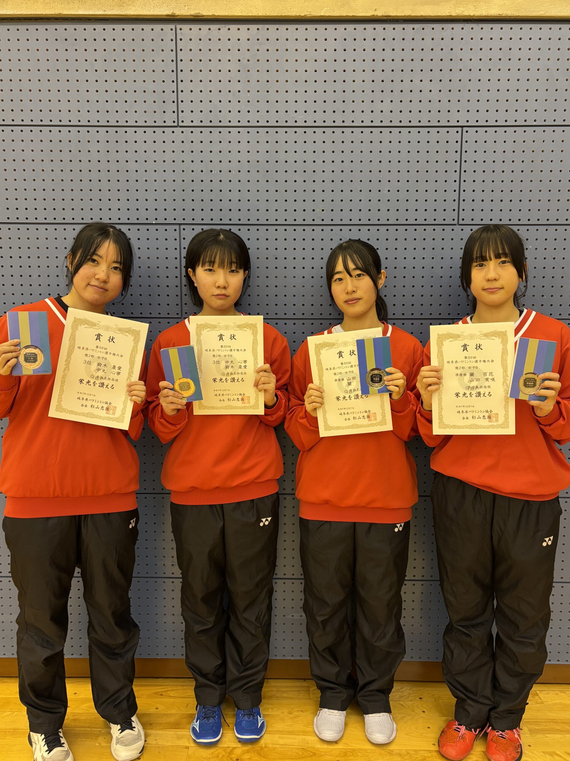 12月7日(日)大垣市総合体育館と大垣城ホールで開催された岐阜県バドミントン選手権大会(複2部)で男子が優勝と3位入賞、女子が2位と3位に入賞しました。