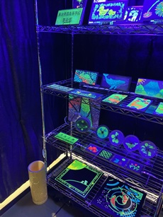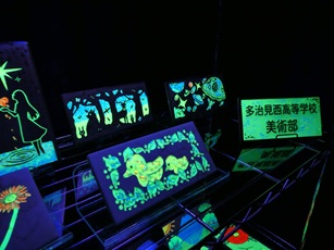 月光工房さんの協力のもと、過去に製造された多治見のタイルに蓄光剤を施し、暗闇で光る作品を製作し、き業展に展示しました。