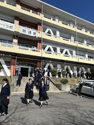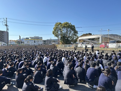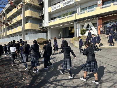 今回は、通常の避難経路の一部が(建物の崩落などにより)通行できない事態を想定し、別の経路を通って校舎外に避難する訓練となりました。慣れない経路を通っての避難であったため、全員が避難完了し点呼を終えるまでの時間は通常よりもかかってしましましたが、私語なく粛々と訓練に取り組む姿が見られました。