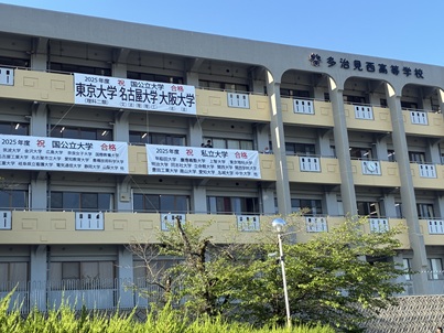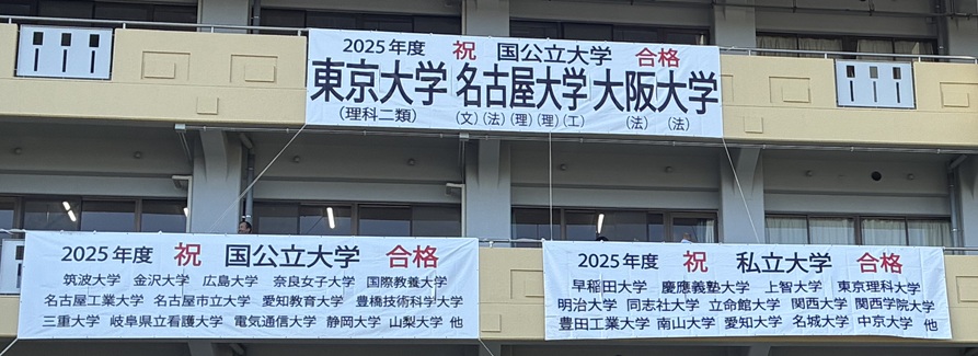 2025年度卒業生の合格実績を讃えた横断幕を、1号館南側壁面に掲げました。