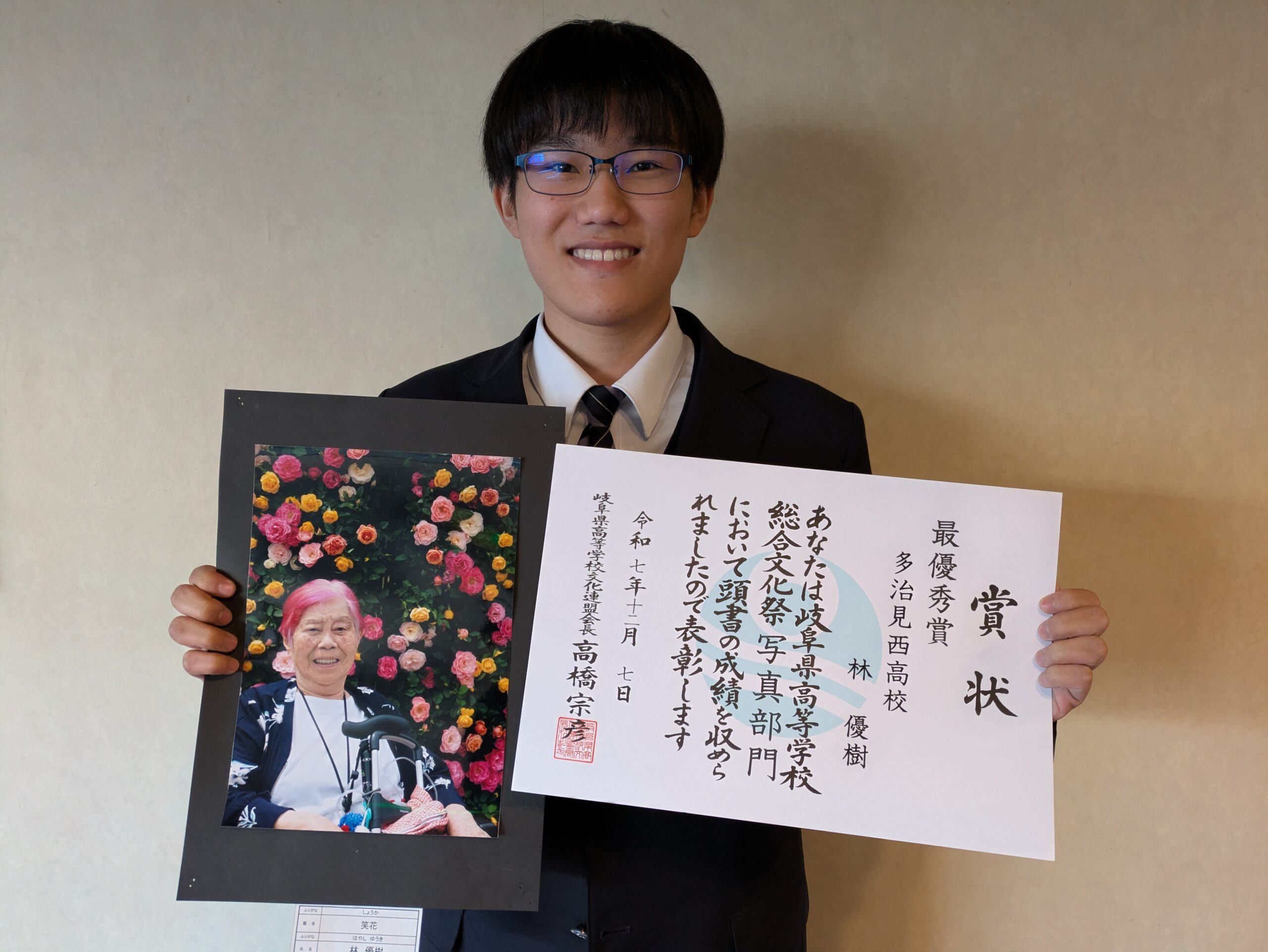 12月7日(日)岐阜市文化センターにて開催された岐阜県高等学校総合文化祭写真部門で林優樹さん(2年)が最優秀賞(407作品中の3作品)を受賞しました。