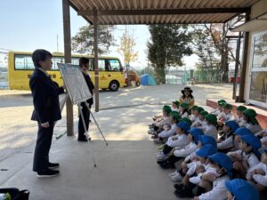 交通指導員さんから どんなふうに歩くか どんな事に気をつけたら良いかをパネルを使ったお話を聞きました
