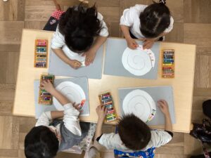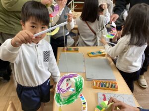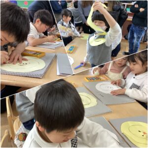 年中さんはハサミを使いぐるぐる渦巻きを線に沿って切る・・・・するとどーでしょう(๑✦ˑ̫✦)✨びよ〜んと伸びてヘビのようになりました