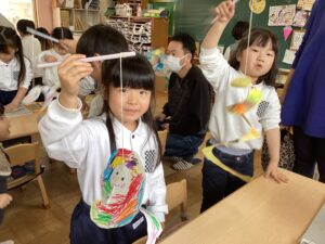 糸とストローで繋げる時はお家の人にちょっとお手伝いしてもらいモビールになりました