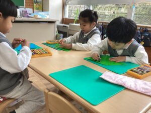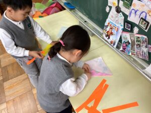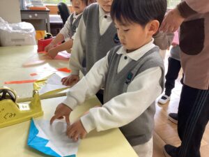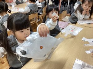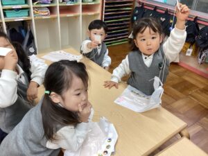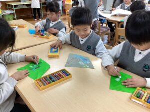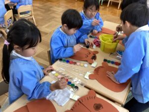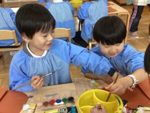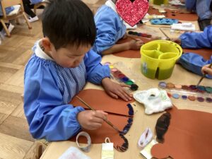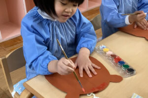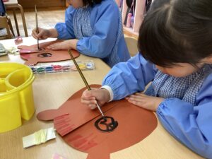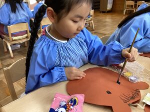 年長さんは画用紙を馬の顔型に切り、絵の具で顔を描き…
