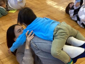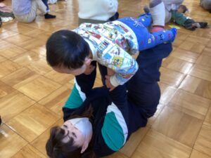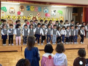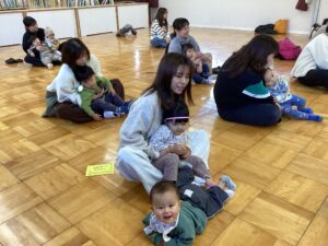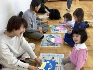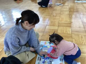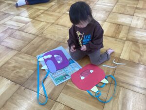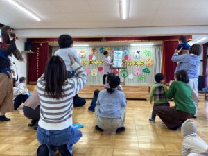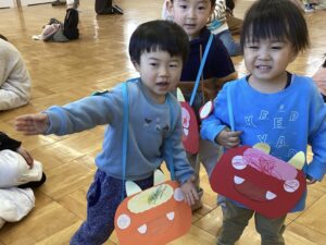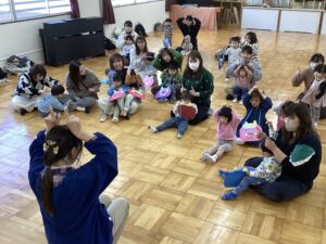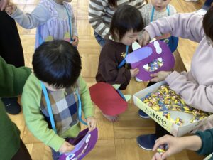 桃組、柿組のお友だちと朝のうたを歌い、体操教室の先生と親子体操を楽しみ、鬼の豆バックを作って 、大型絵本の読み聞かせもあり、盛り沢山の内容で⸜(*ˊᗜˋ*)⸝ みんな最後まで楽しんでくれました
