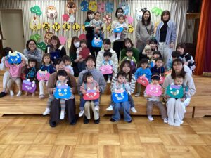 可愛い鬼のバックには、ラムネのプレゼントを詰めて もらい喜んで掛けて帰って行きました