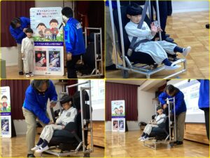 衝突実験映像のDVDを見せてもらい、シートベルトコンビンサーに乗って時速5キロの衝突衝撃体験をしました